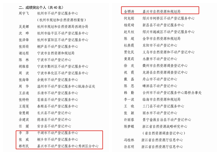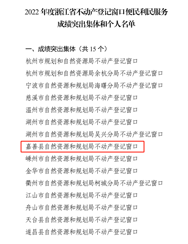 发布日期:2023-03-31 14:49 浏览次数:近日,浙江省自然资源厅对全省不动产登记窗口便民利民服务成绩突出集体和个人予以表彰。嘉善县自然资源和规划局不动产登记窗口被评选为“2022年度浙江省不动产登记窗口便民利民服务成绩突出集体”;平湖市不动产登记服务中心李萍、桐乡市不动产登记服务中心张威、嘉兴市不动产登记服务中心秀洲区分中心都利民、嘉兴市自然资源和规划局金赟涛等4位同志被评选为“2022年度浙江省不动产登记窗口便民利民服务成绩突出个人”。